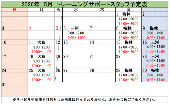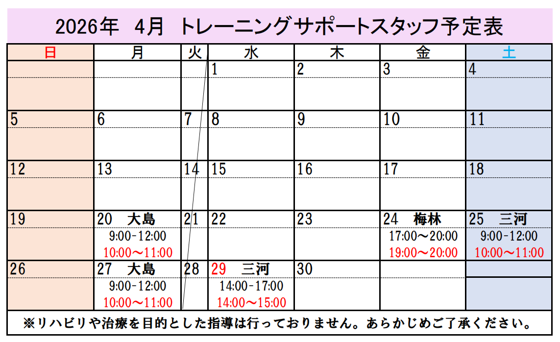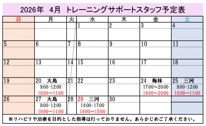 3月 フレトピアトレーニング室 サポートスタッフ表